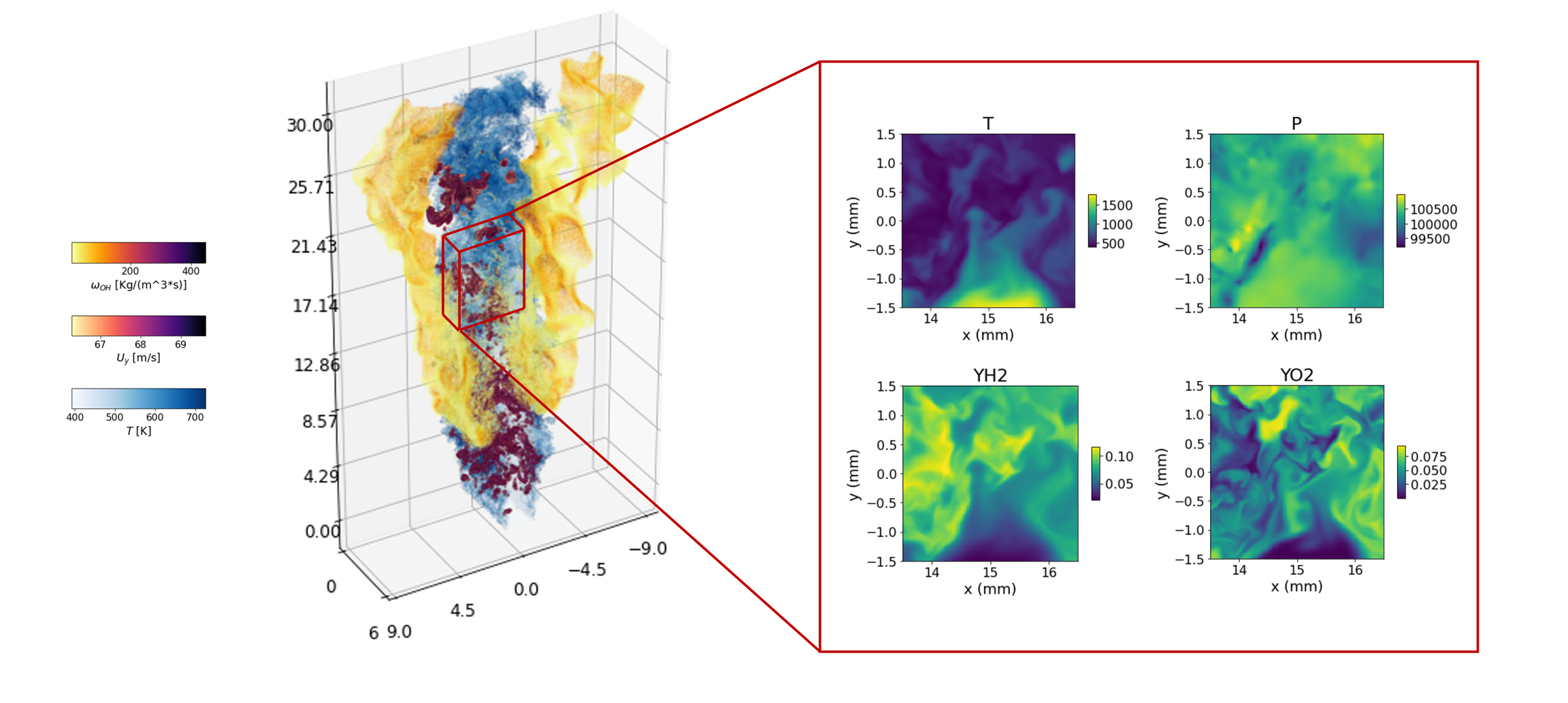 The dataset is extracted from a DNS simulation of a lifted non-premixed hydrogen flame. The variables saved comprise Temperature, Species Mass Fractions, 3 Velocity components, and Pressure. The chemical mechanism used comprises 9 species.